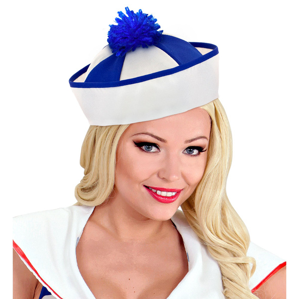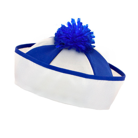 Czapka majtka wykonana z granatowo-białego materiału, obszyta granatową lamówką. Na czubku doczepiony granatowy pompon z wełny.
