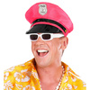 Czapka policyjna wykonana z różowego materiału, z przodu naklejony emblemat w kolorze srebrnym.