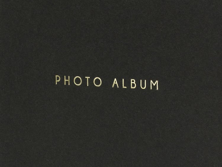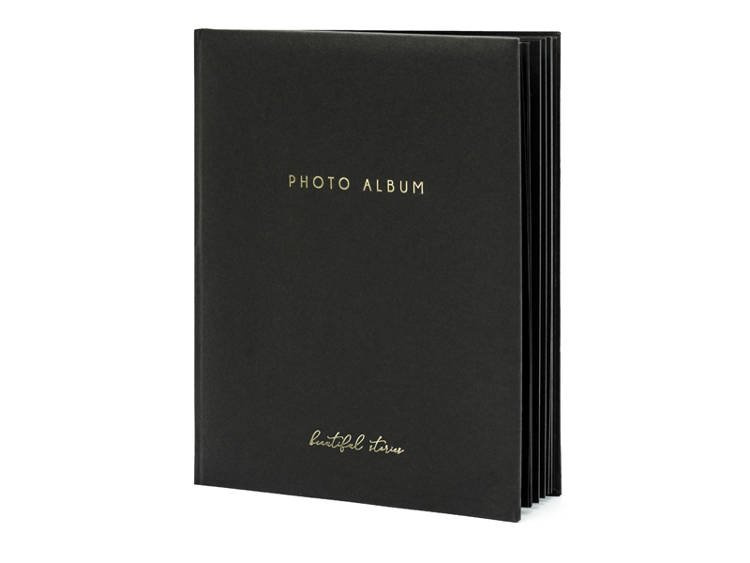 Album na zdjęcia oprawiony papierem w kolorze czarnym, ze złotym napisem Photo album, beautiful stories, wymiary ok. 20 x 24,5 cm, 22 czarne kartki.