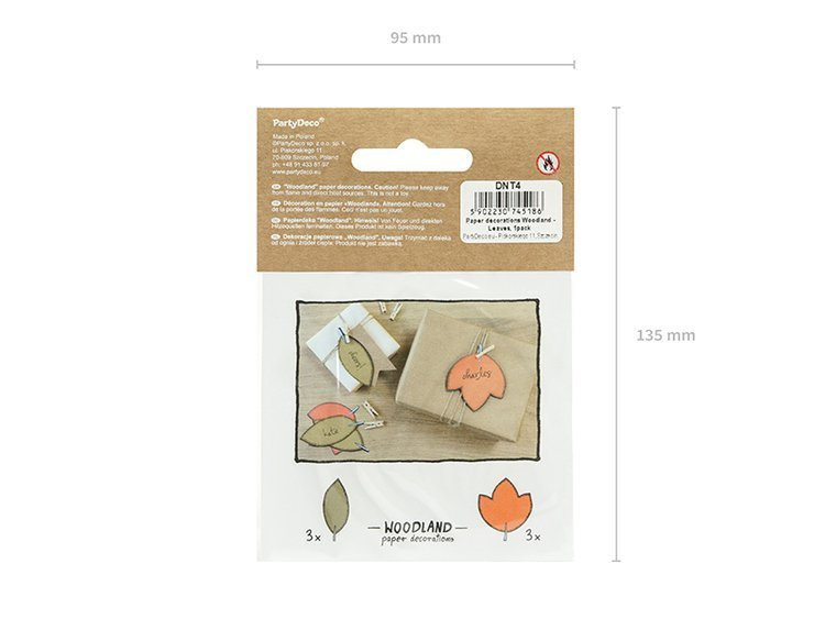 Dekoracje papierowe Woodland - Liście, zestaw zawiera dekoracje w kształcie liści klonu (wymiary ok. 8 x 9,5 cm, 3 szt.) i liści buku (wymiary ok. 4 x 10 cm, 3 szt.).(1 karton / 50 op.)(1 op. / 6 szt.)