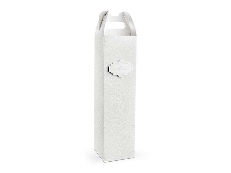 Pudełka na alkohol z papieru z jasnoszarym nadrukiem i napisem Merci!, wymiary po złożeniu 8x8x29 centymetrów.(1 op. / 10 szt.)