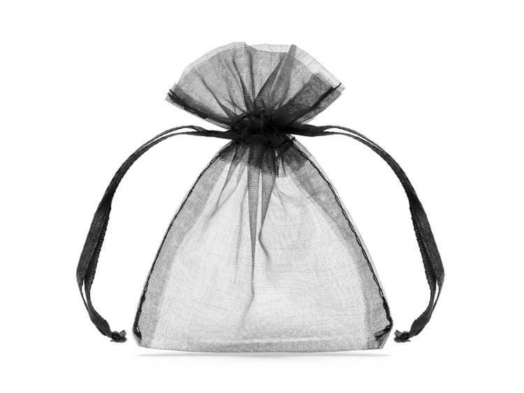 Ściągane woreczki z gładkiej organzy w kolorze czarnym, wymiary 7,5x10 centymetrów. Idealne dla gości weselnych.(1 karton / 50 op.)(1 op. / 20 szt.)