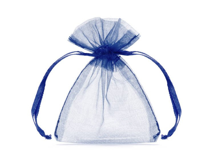 Ściągane woreczki z gładkiej organzy w kolorze granatowym, wymiary 7,5x10 centymetrów. Idealne dla gości weselnych.(1 karton / 50 op.)(1 op. / 20 szt.)