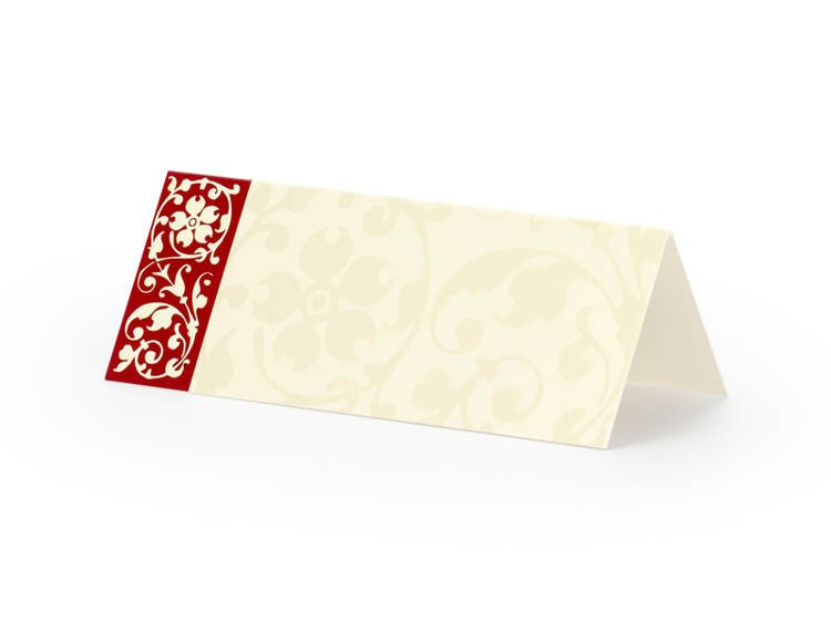 Wizytówki na stół z papieru w kolorze kremowym, z bordowym wzorem, wymiary 10x4 centymetry.(1 op. / 25 szt.)