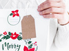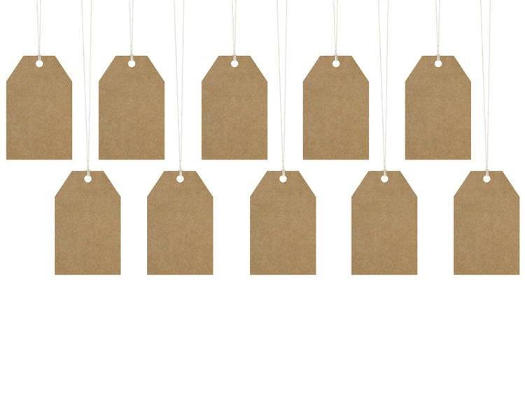 Zawieszki do prezentów Merry Xmas w kolorze kraftowym. Zestaw zawiera 10 zawieszek (wymiary ok. 5 x 8,5 cm) i ok. 3,5 m lnianego bielonego sznurka.(1 karton / 40 op.)(1 op. / 10 szt.)