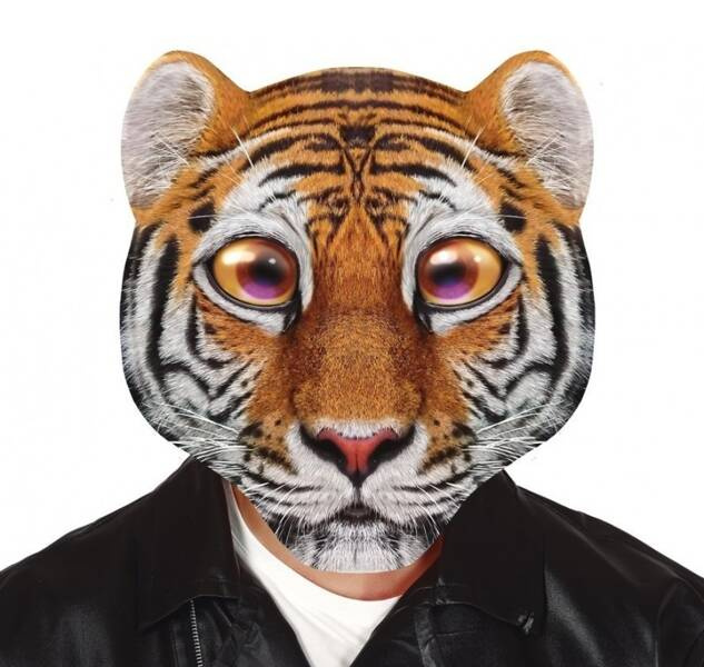 Maska tygrysa wykonana z pianki z nadrukiem.