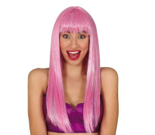 Peruka z długimi prostymi różowymi włosami i grzywką.