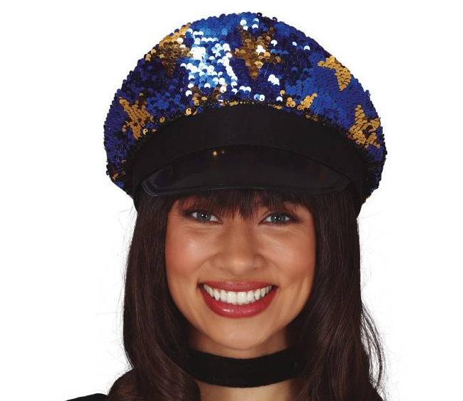 - Czapka pokryta dwustronnymi cekinami – niebieskimi i złotymi, które tworzą kształty gwiazdek.
