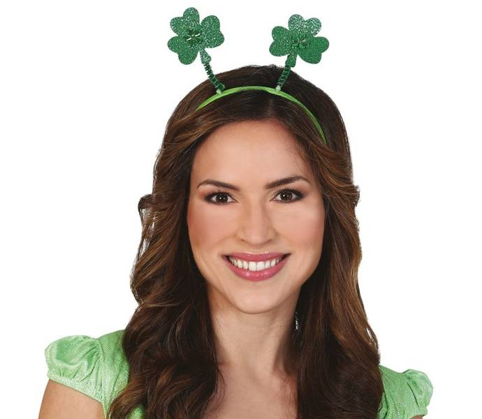 Do opaski przyczepione sprężynki, do których zamocowano dwie zielone koniczynki.