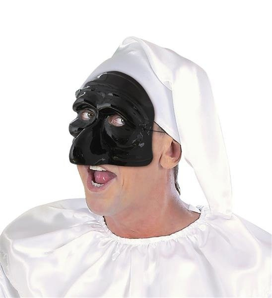 Maska z dużym bulwiastym nosem. Ma wycięte otwory na oczy. Wykonana z plastiku. Mocowana na gumce. Kolor czarny, z połyskiem.