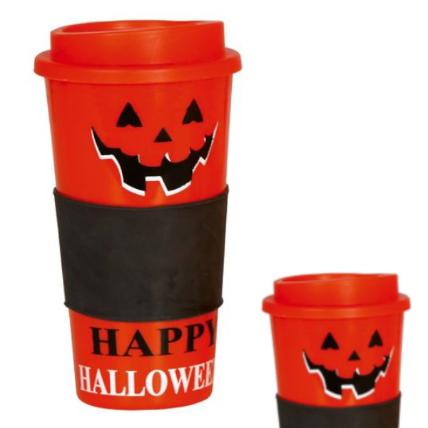 Ozdobiony motywem uśmiechniętej dyni oraz napisem Happy Halloween.