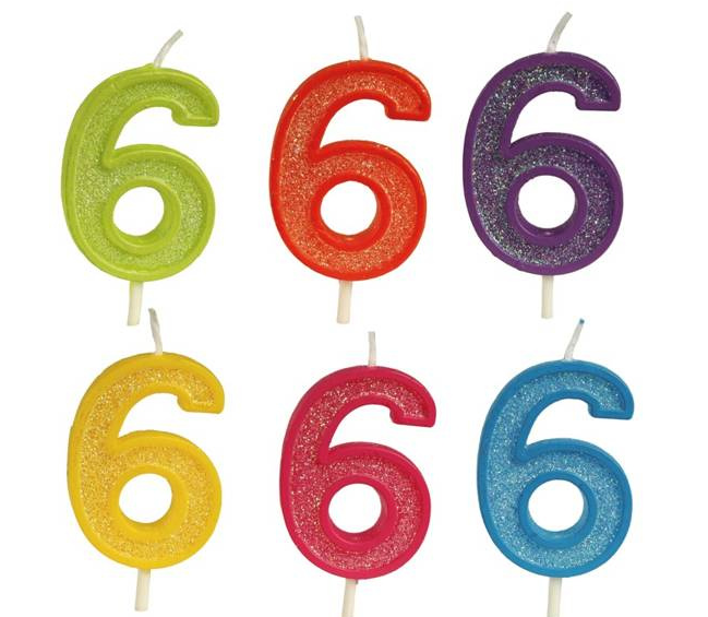 Swieczki Brokatowe Cyfra 6, 6 róznych ko