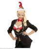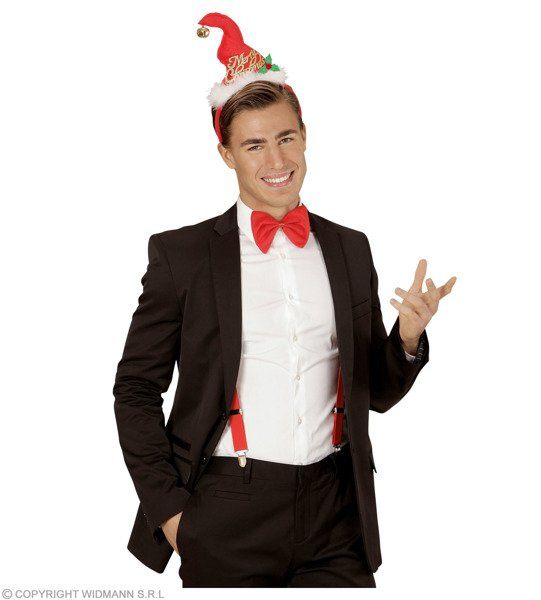 Opaska wykonana z solidnego tworzywa z czapką świąteczną. Zdobiona dzoneczkiem, brokatowym napisem, puszkiem i dekoracją imitującą jemiołę.