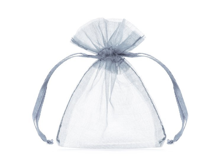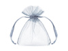 Ściągane woreczki z gładkiej organzy w kolorze srebrnym, wymiary ok. 7,5x10 cm.