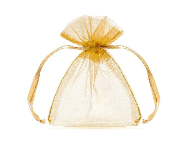 Ściągane woreczki z gładkiej organzy w kolorze złotym.