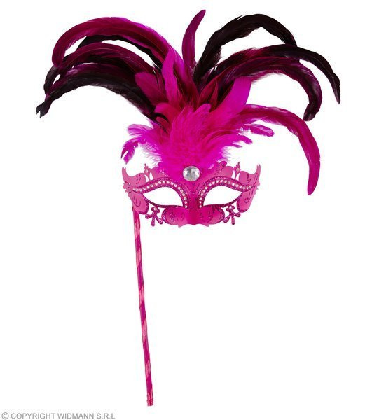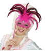 Maska koloru różowego. Wykonana z usztywnionego tworzywa. Zdobiona brokatem, dużymi piórami i srebrnymi cyrkoniami.
