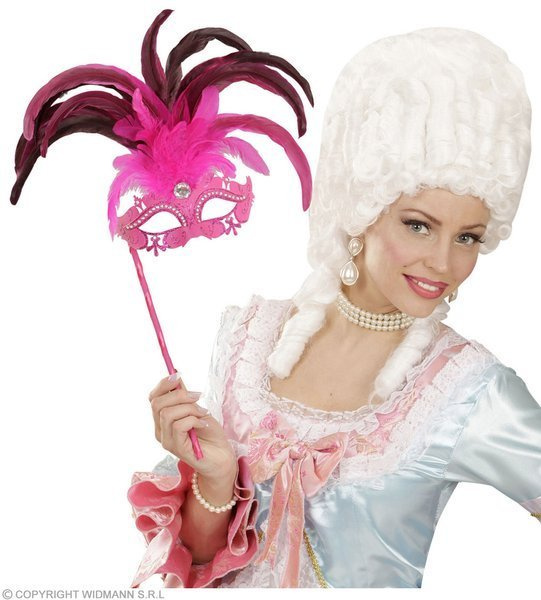 Maska mocowana na rączce zdobionej różową tasiemką.