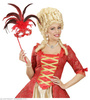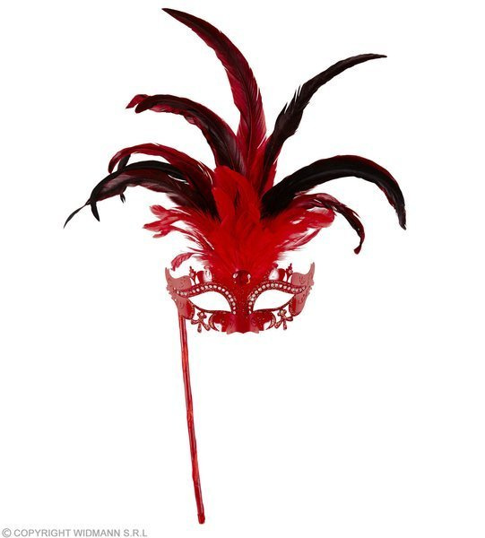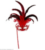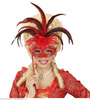 Maska koloru czerwonego. Wykonana z usztywnionego tworzywa. Zdobiona brokatem, dużymi piórami i srebrnymi cyrkoniami.
