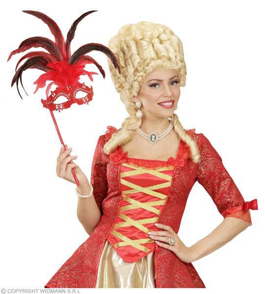 Maska mocowana na rączce zdobionej czerwoną tasiemką.