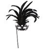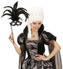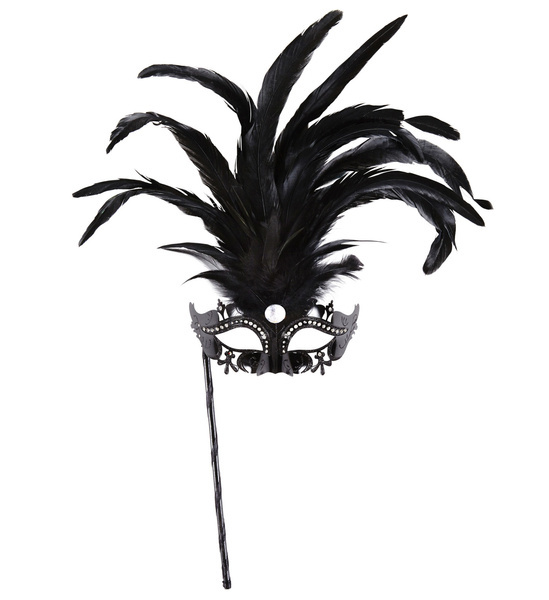 Maska mocowana na rączce zdobionej czarną tasiemką.