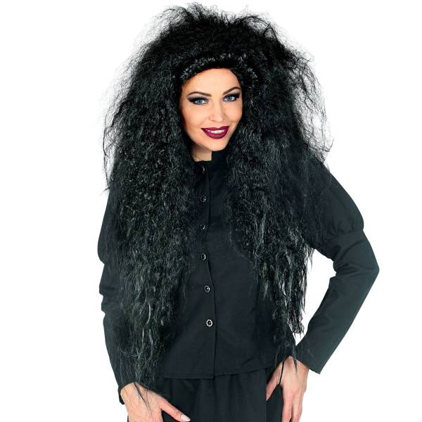 Gęste, długie włosy lekko karbowane w kolorze czarnym.