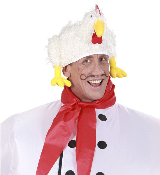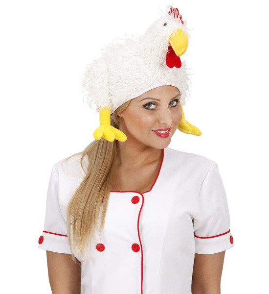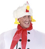 Czapka ma doszytą głowę kury, dziób, oczy i krzebień.