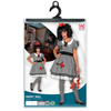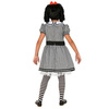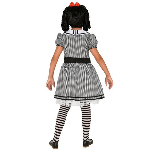 Sukienka lalki w kolorze szarym z białym kołnierzykiem i czarnymi zdobieniami.