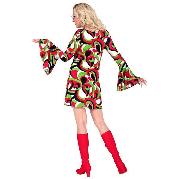 Sukienka w stylu lat 70 z długim, rozszerzanym rękawem.