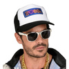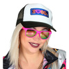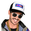 W tyle siatka, przód ozdobiony kolorowym napisem.