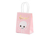 Torebka na prezent w kolorze różowym z biało-czarno-złotym nadrukiem.