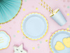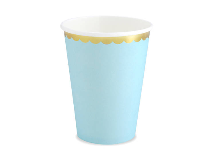 • Kubeczki papierowe w kolorze jasnoniebieskim ze złotymi metalizowanymi brzegami.