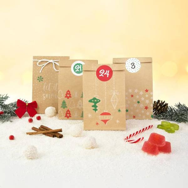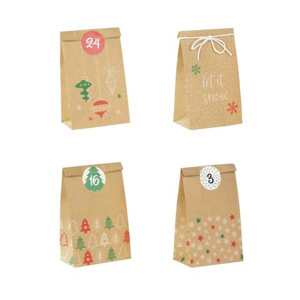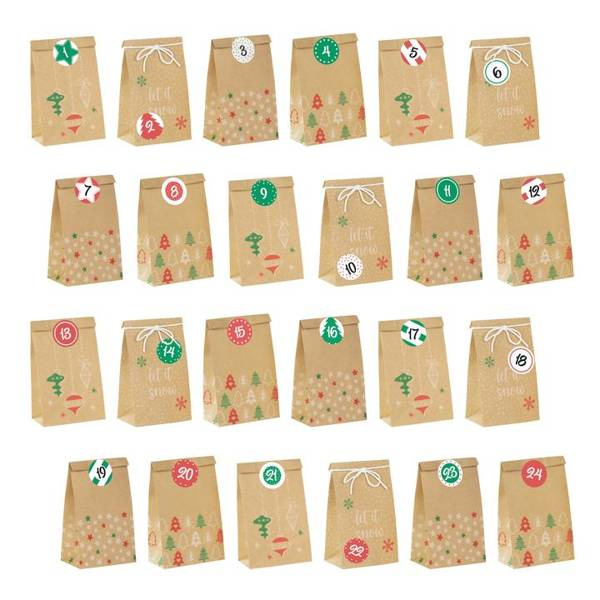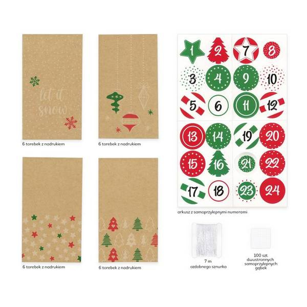 24 sztuki, w tym 24 torebki papierowe, karta naklejek z kolorowymi liczbami, 7 m dekoracyjnego sznurka, pianki do klejenia