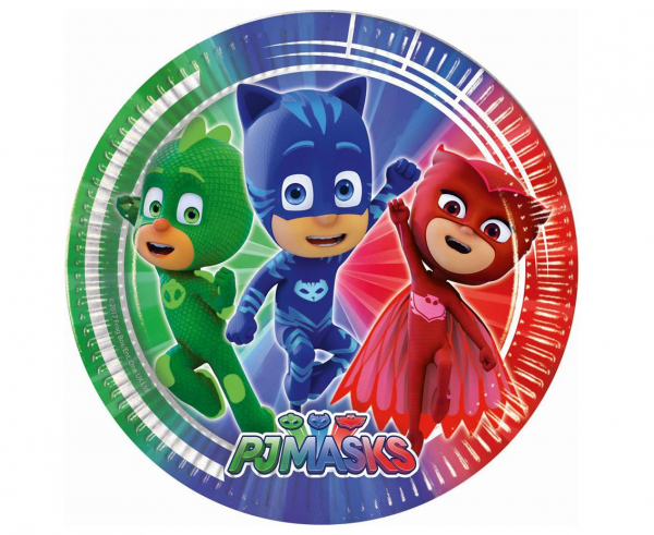 Talerzyki okrągłe papierowe z bohaterami bajki PJ Masks.