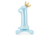 Stojący metalizowany balon foliowy cyfra 1 w kolorze błękitnym ze złotą koroną.