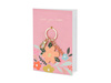 Kartka w kolorze różowym z napisem " Love you mom " z kopertą w kolorze czerwonym i breloczkiem w kształcie kwiatka.