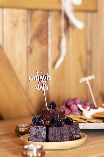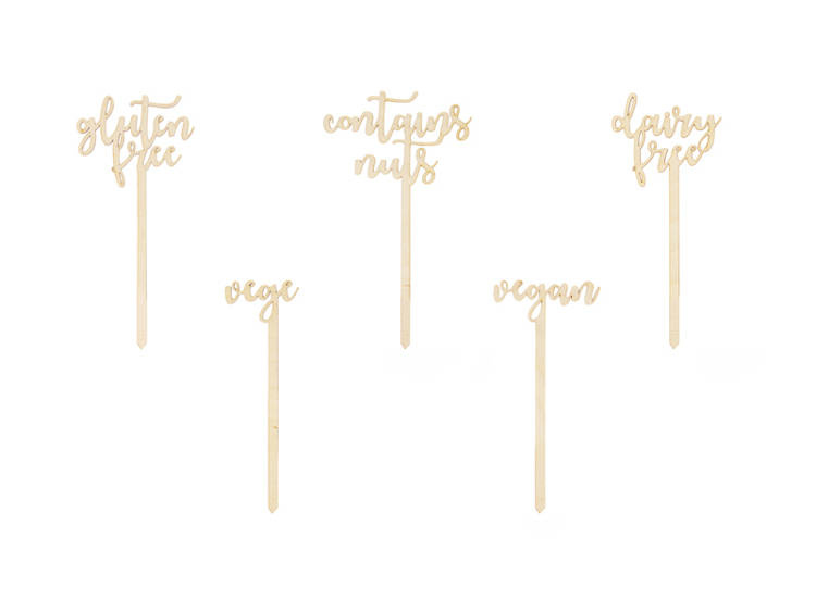 Zestaw zawiera 5 topperów z napisami: Vege, Vegan, Dairy free, Contains nuts i Gluten free.