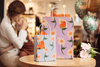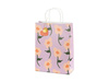 Torebka na prezenty Kwiaty w kolorze fioletowym z kolorowym nadrukiem i 2 zawieszki w kształcie serc.