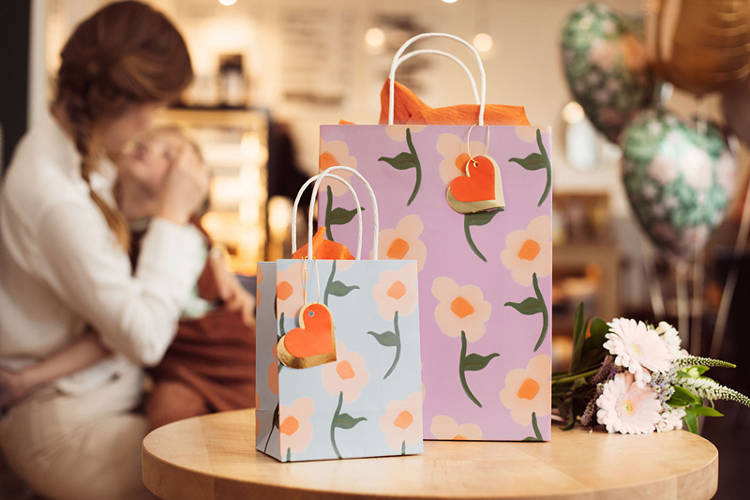 Torebka na prezenty Kwiaty w kolorze fioletowym z kolorowym nadrukiem i 2 zawieszki w kształcie serc.