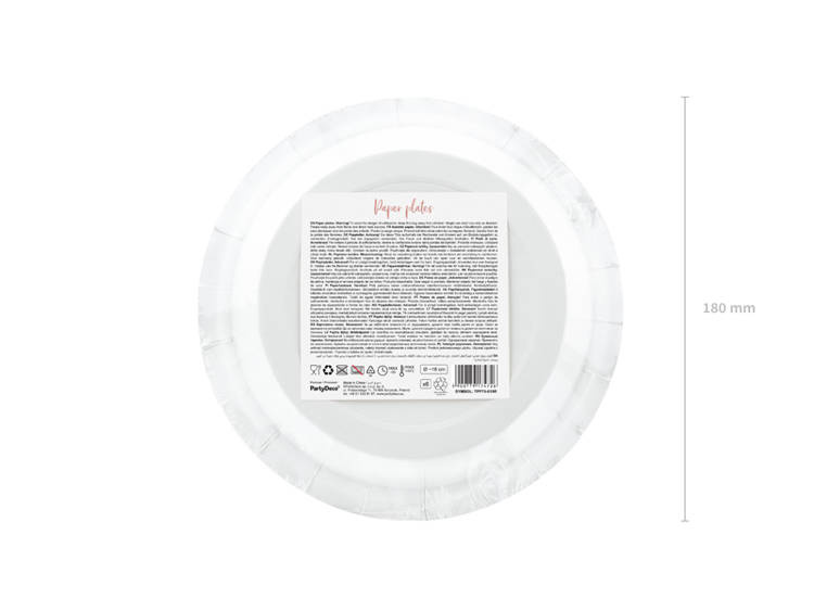Talerzyki papierowe w kolorze różowego złota z białym napisem Happy Birthday!, średnica ok. 18 cm.