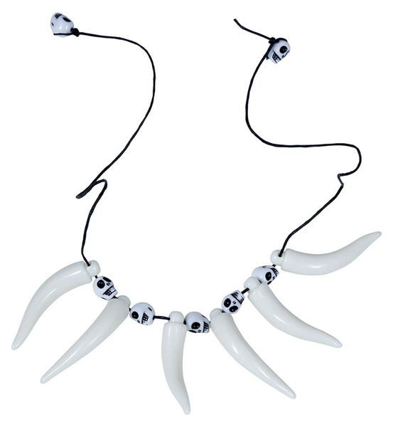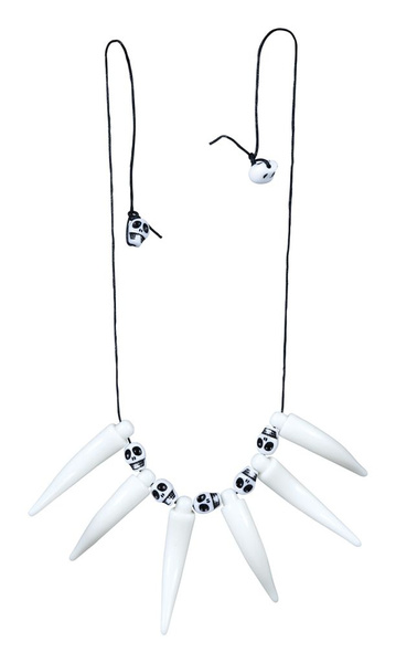 Ozdobiony koralikami w kształcie kości oraz czaszek.