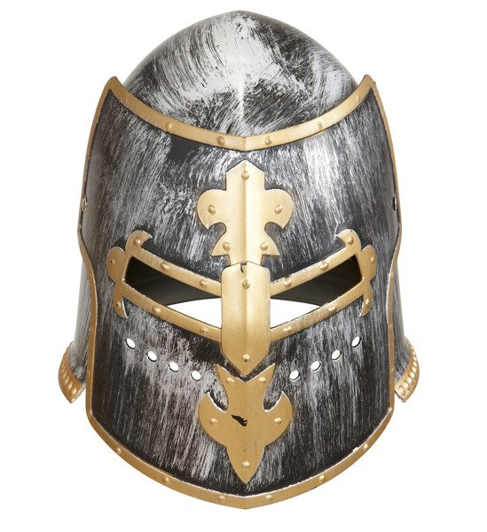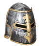 Hełm rycerza z osłoną, ruchomą przyłbicą. Wykonany z tworzywa sztucznego. Kolor: srebrno-złoty.