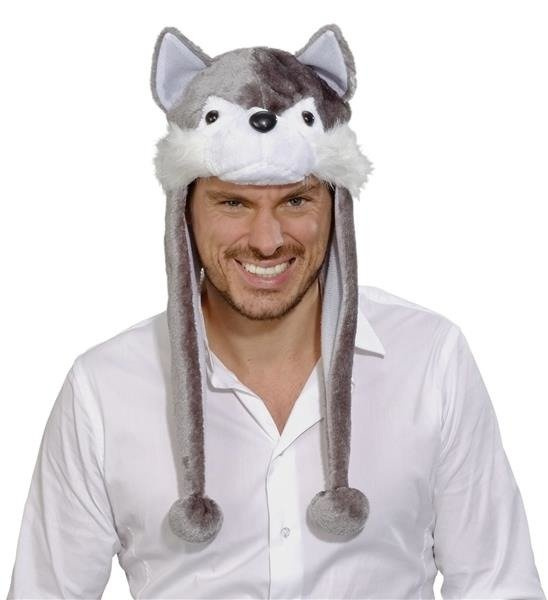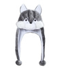 Czapeczka wilka uszyta z ciepłego pluszowego materiału. Kolor: szaro-biały. Unisex. Czapka mz uszkami, noskiem i oczkami wilka.