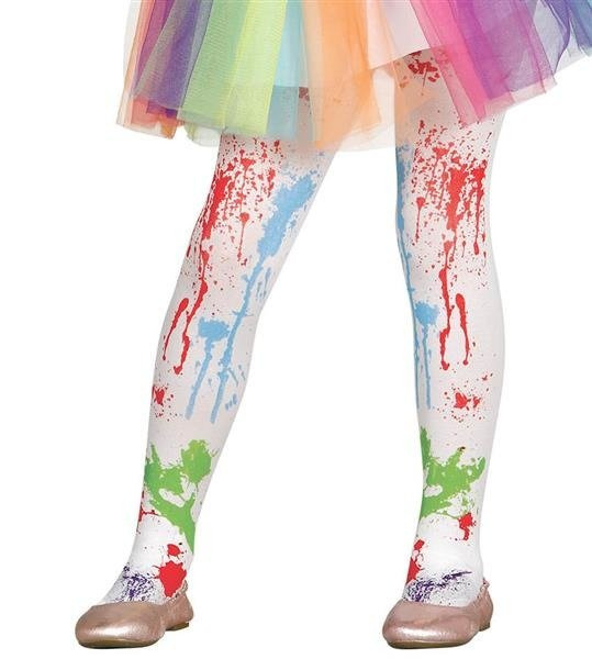 Białe rajstopy z kolorowymi plamkami przeznaczone dla dzieci.