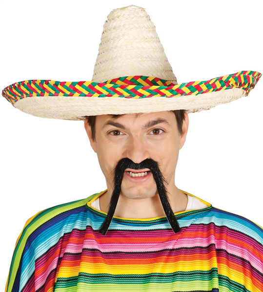 Słomkowe sombrero z kolorowym wzorem na obwodzie.