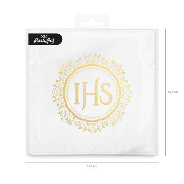 Serwetki papierowe w kolorze białym na I Komunię Świętą ze złotym motywem IHS. Wymiary- ok. 33 x 33 cm. 10 sztuk w opakowaniu.