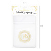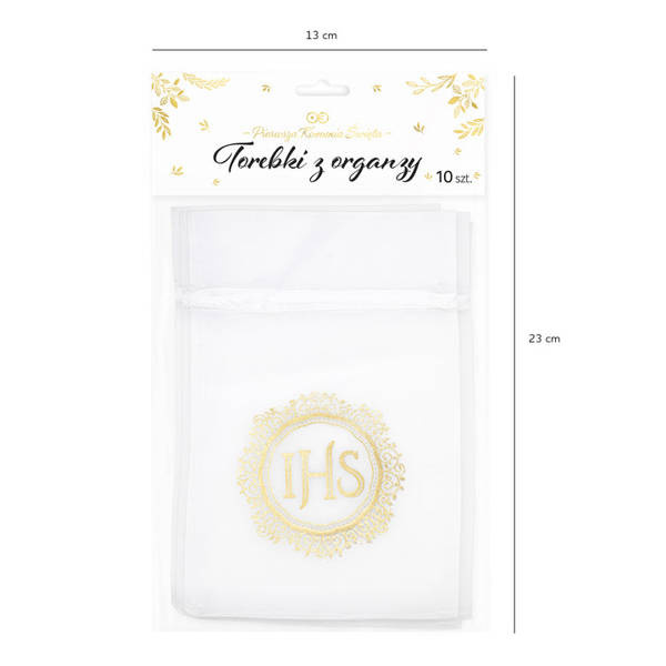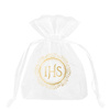 Ściągane woreczki z gładkiej organzy w kolorze białym z nadrukiem IHS.
