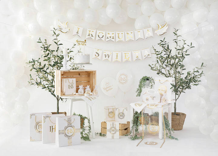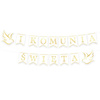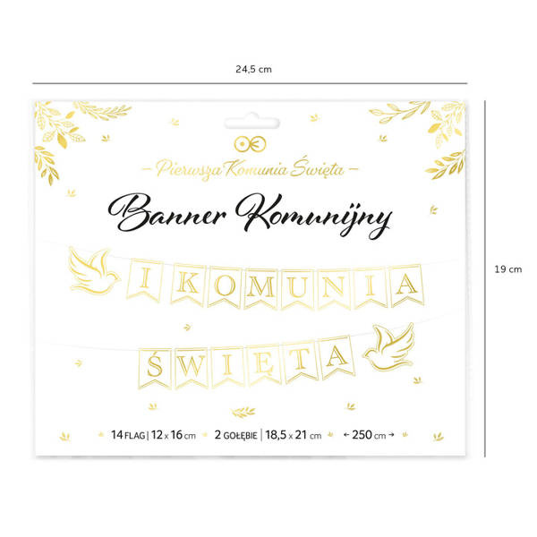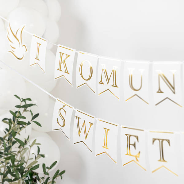 Papierowa jednostronna girlanda z napisem I Komunia Święta i gołębiami.