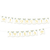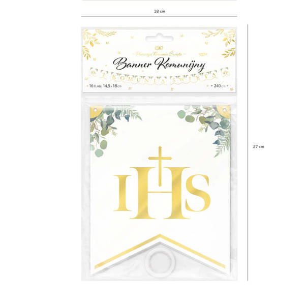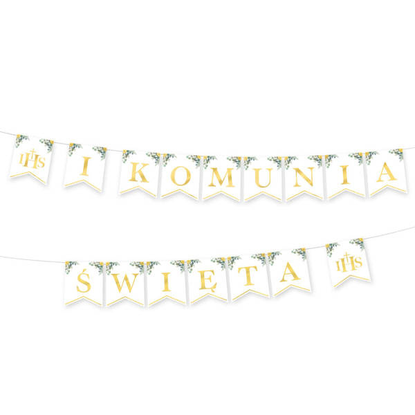 Papierowa jednostronna girlanda z napisem I Komunia Święta i ozdobą eukaliptusa.