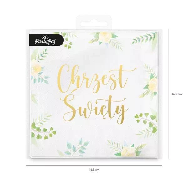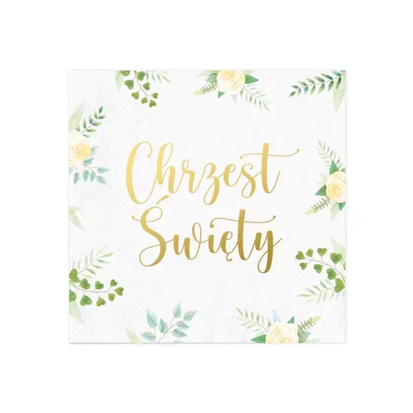 Serwetki papierowe w kolorze białym ze złotym napisem Chrzest Święty i zielonymi dodatkami.