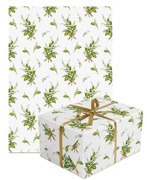 Delikatny wzór z motywem konwalii ze złotą kokardką.